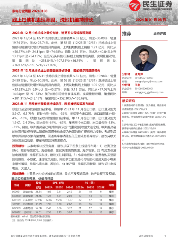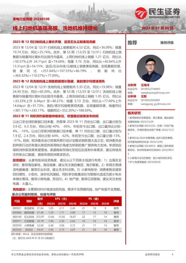 【民生证券】【20240108】家电行业周报:线上扫地机表现亮眼,洗地机维持增长-15页