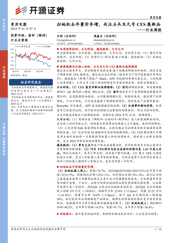 【开源证券】【20240107】20240107-开源证券-家用电器行业周报:扫地机全年量价齐增,关注石头及九号CES展新品-16页