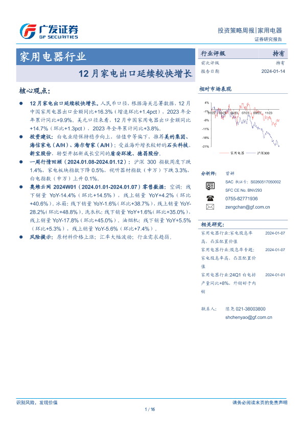 【广发证券】【20240114】20240114-广发证券-家用电器行业投资策略周报:12月家电出口延续较快增长-16页