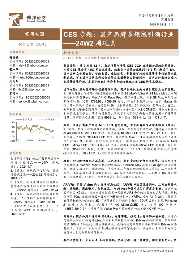 【德邦证券】【20240114】20240114-德邦证券-家用电器24W2周观点:CES专题:国产品牌多领域引领行业-25页