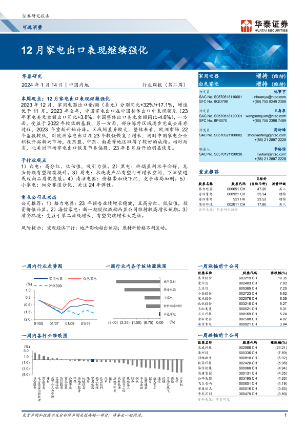 【华泰证券】【20240114】20240114-华泰证券-可选消费行业周报(第二周):12月家电出口表现继续强化-15页