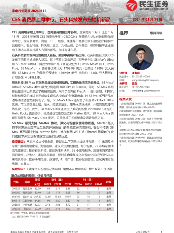 【民生证券】【20240115】家电行业周报:CES消费展上周举行,石头科技发布扫地机新品-14页
