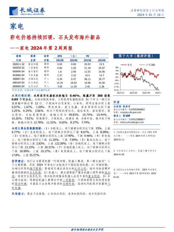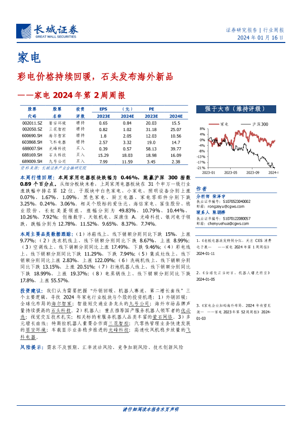 【长城证券】【20240116】家电行业2024年第2周周报:彩电价格持续回暖,石头发布海外新品-22页