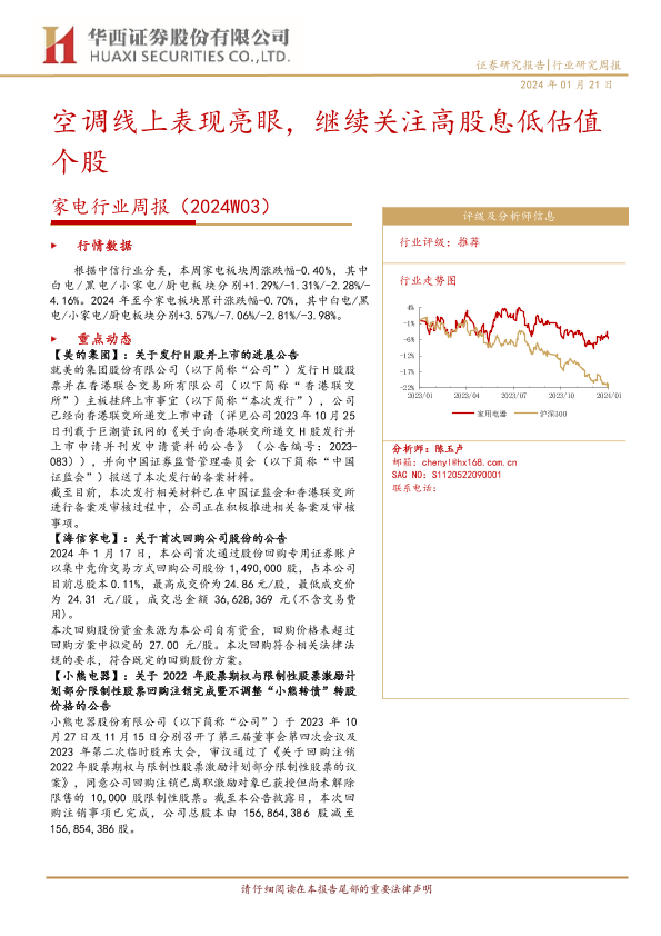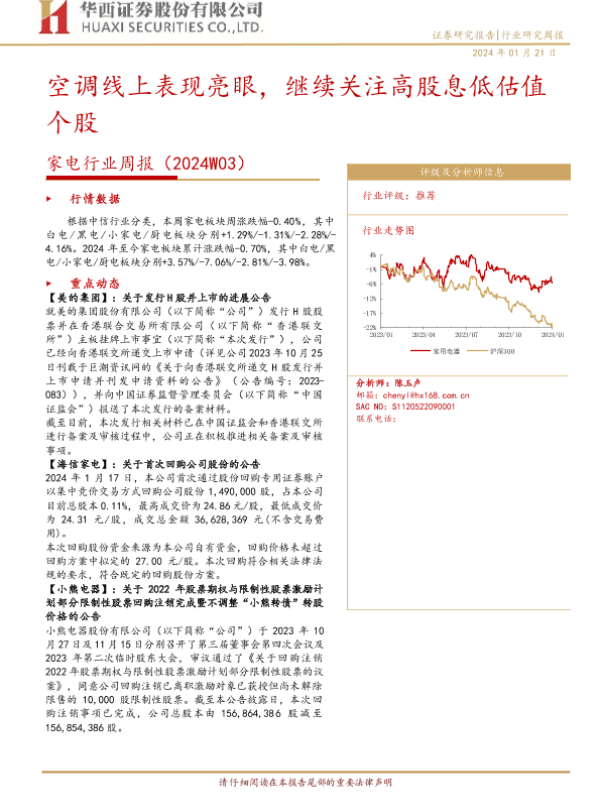 【华西证券】【20240121】家电行业周报(2024W03):空调线上表现亮眼,继续关注高股息低估值个股-12页