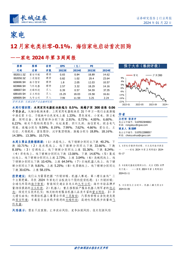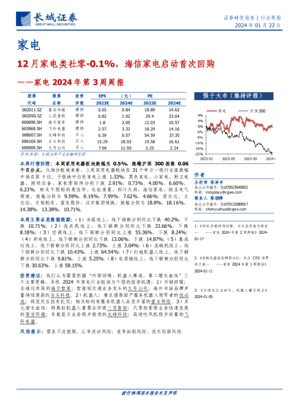 【长城证券】【20240122】家电2024年第3周周报:12月家电类社零-0.1%,海信家电启动首次回购-24页