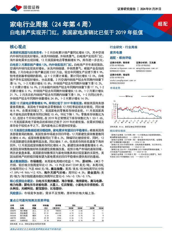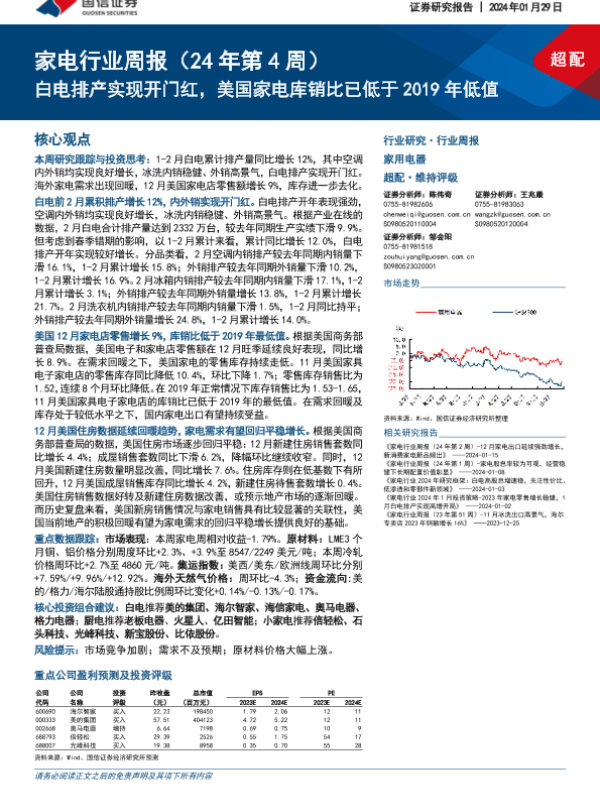 【国信证券】【20240129】家电行业周报(24年第4周):白电排产实现开门红,美国家电库销比已低于2019年低值-15页