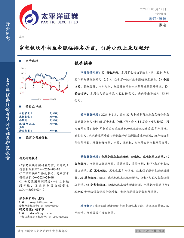 【太平洋证券】【20240317】20240317-太平洋-家电行业周报:家电板块年初至今涨幅排名居首,白厨小线上表现较好-12页