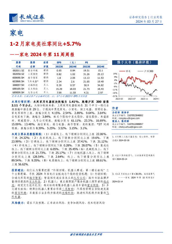 【长城证券】【20240327】家电行业2024年第11周周报:1-2月家电类社零同比+5.7%-22页