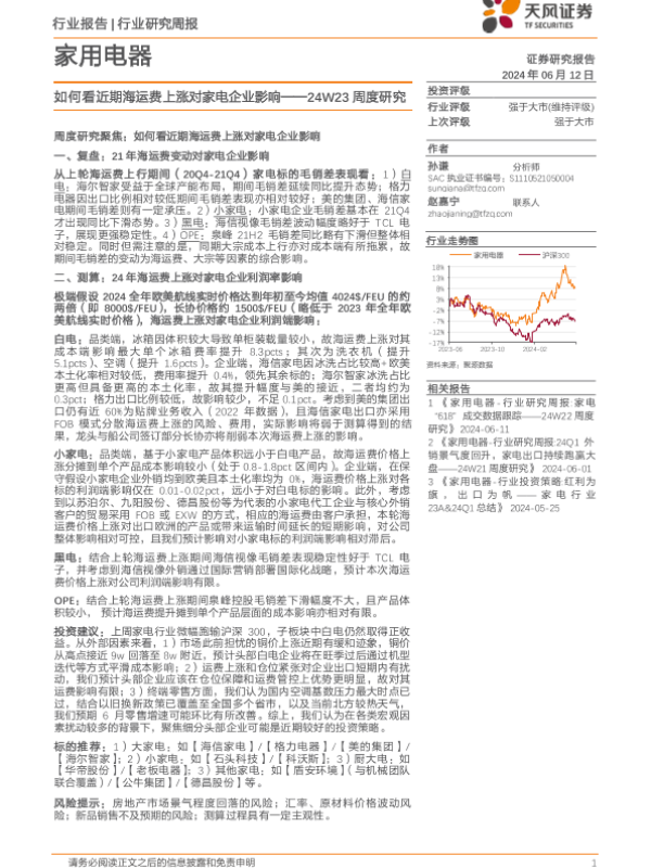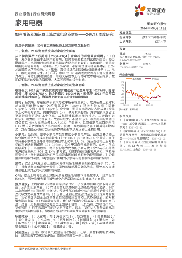 【天风证券】【20240612】家用电器行业24W23周度研究:如何看近期海运费上涨对家电企业影响-14页
