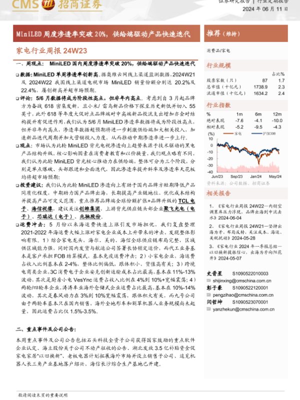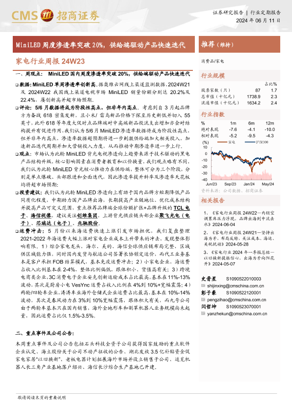 【海通证券】【20240611】家电行业周报24W23:MiniLED周度渗透率突破20%,供给端驱动产品快速迭代-11页