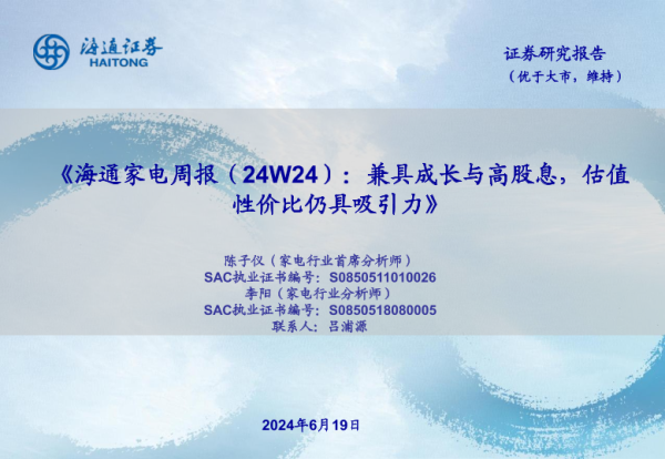 【海通证券】【20240619】20240619-海通证券-家电行业周报(24W24):兼具成长与高股息,估值性价比仍具吸引力-15页