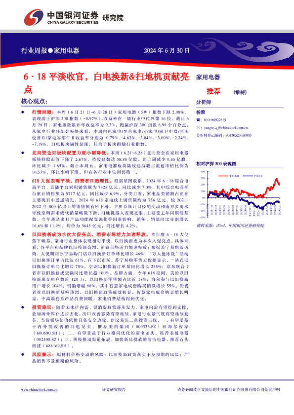 【银河证券】【20240630】20240630-中国银河-家用电器行业周报:6·18平淡收官,白电换新&扫地机贡献亮点-12页