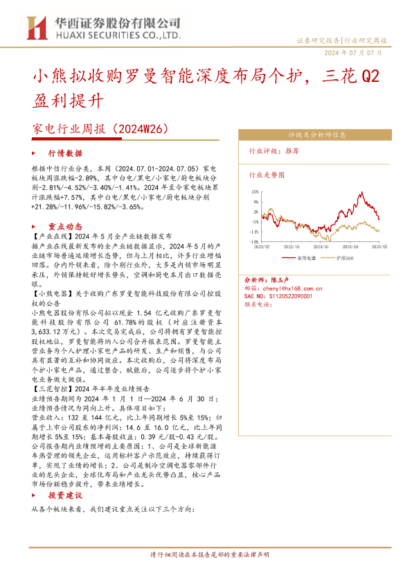 【华西证券】【20240707】20240707-华西证券-家电行业周报(2024W26):小熊拟收购罗曼智能深度布局个护,三花Q2盈利提升-12页