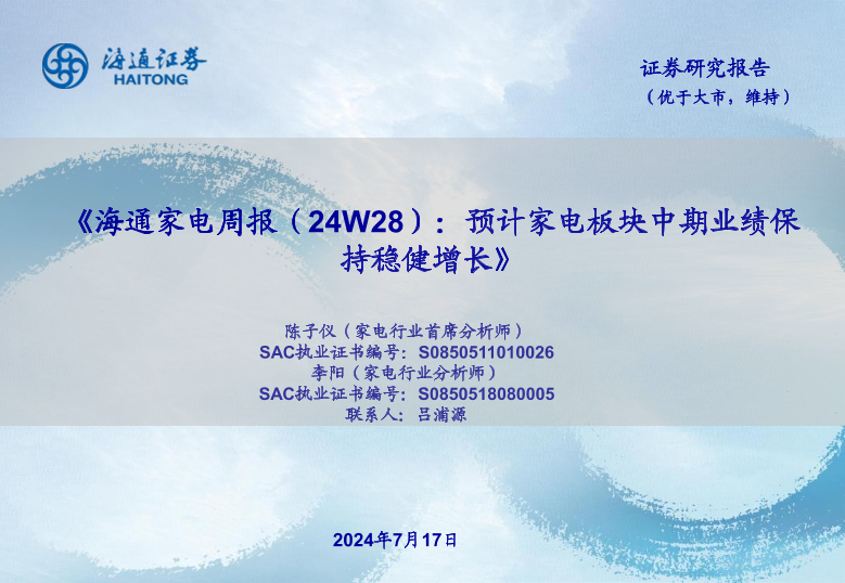 【海通证券】【20240717】海通家电周报(24W28):预计家电板块中期业绩保持稳健增长-17页