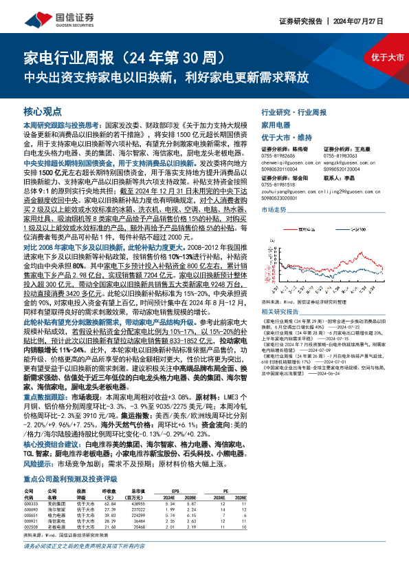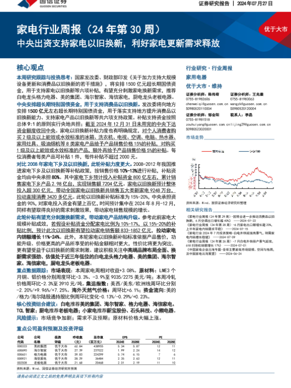 【国信证券】【20240727】家电行业周报(24年第30周):中央出资支持家电以旧换新,利好家电更新需求释放-15页