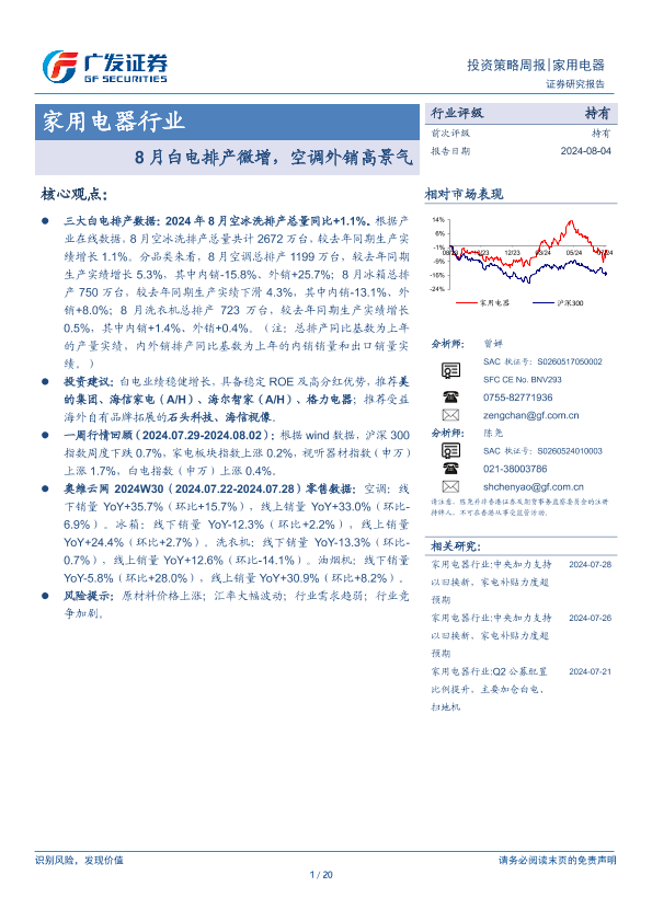 【广发证券】【20240804】20240804-广发证券-家用电器行业投资策略周报:8月白电排产微增,空调外销高景气-20页