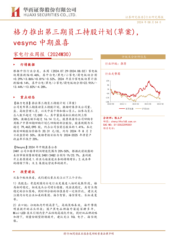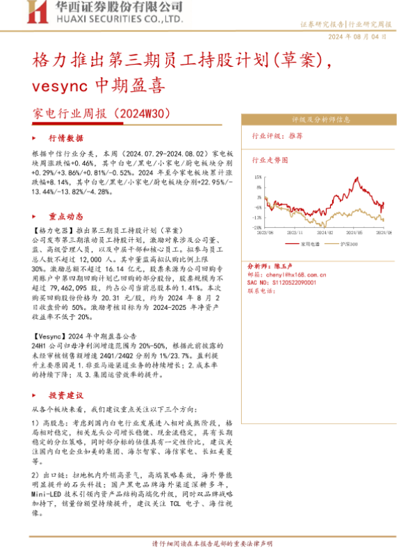 【华西证券】【20240804】20240804-华西证券-家电行业周报(2024W30):格力推出第三期员工持股计划(草案),vesync中期盈喜-12页