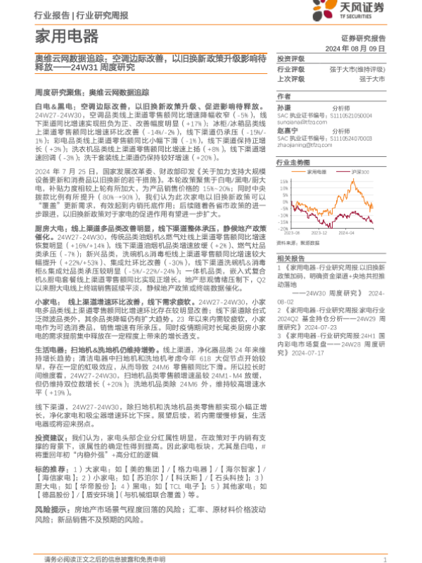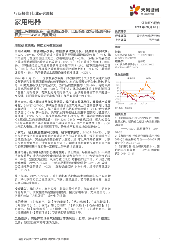 【天风证券】【20240809】家用电器行业24W31周度研究:奥维云网数据追踪,空调边际改善,以旧换新政策升级影响待释放-14页