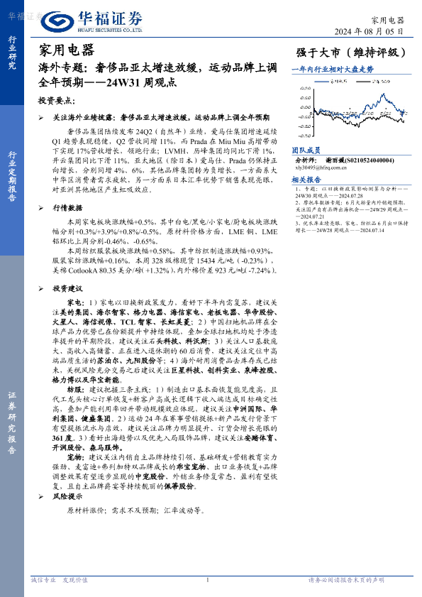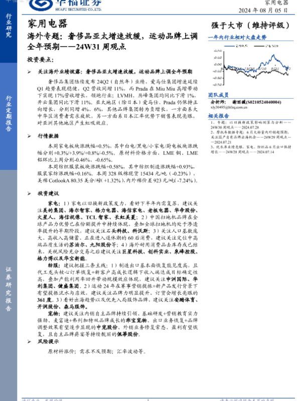 【华福证券】【20240805】家用电器24W31周观点:海外专题:奢侈品亚太增速放缓,运动品牌上调全年预期-17页