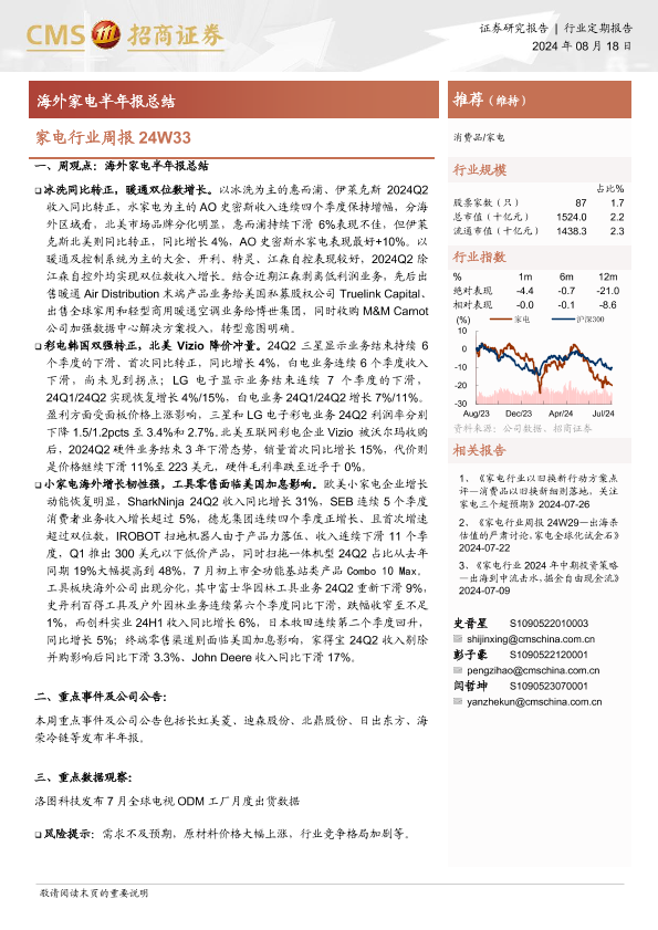 【海通证券】【20240818】家电行业周报24W33:海外家电半年报总结-10页