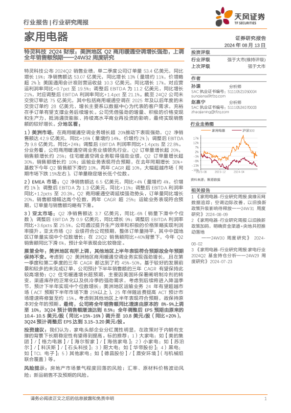 【天风证券】【20240813】家用电器行业24W32周度研究:特灵科技2Q24财报,美洲地区Q2商用暖通空调增长强劲,上调全年销售额预期-12页