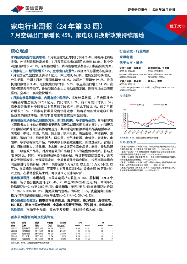 【国信证券】【20240819】家电行业周报(24年第33周):7月空调出口额增长45%,家电以旧换新政策持续落地-13页