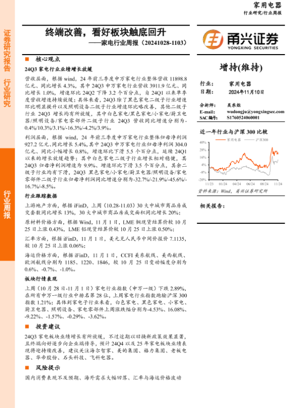 【甬兴证券】【20241110】20241110-甬兴证券-家电行业周报:终端改善,看好板块触底回升-10页