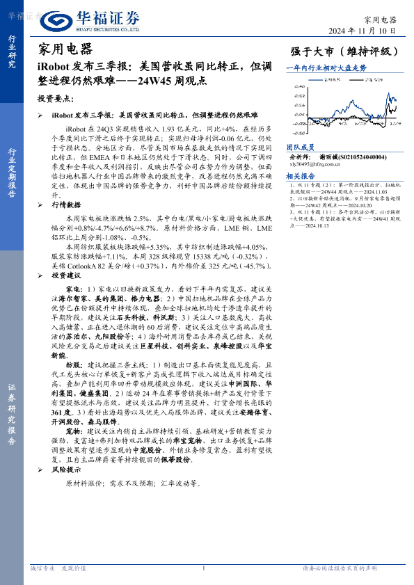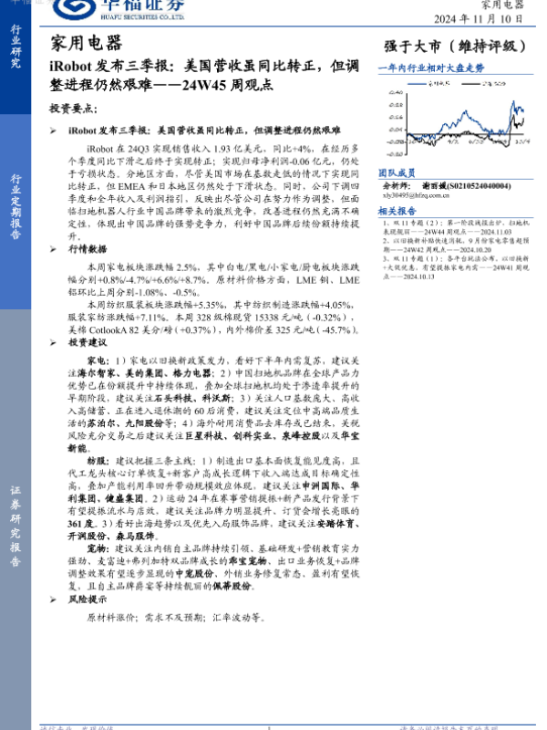 【华福证券】【20241110】家用电器24W45周观点:iRobot发布三季报:美国营收虽同比转正,但调整进程仍然艰难-15页