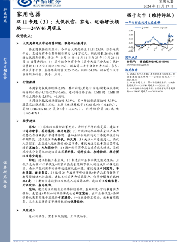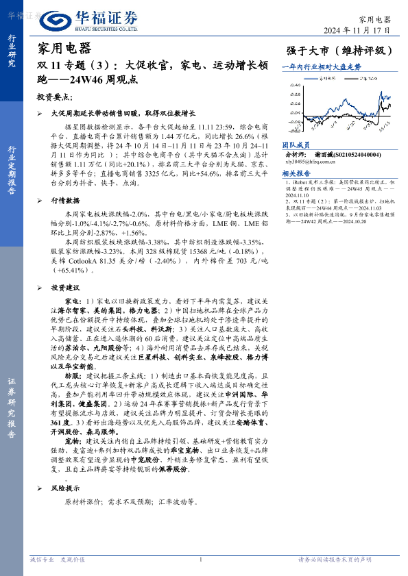 【华福证券】【20241117】家用电器24W46周观点:双11专题(3):大促收官,家电、运动增长领跑-16页