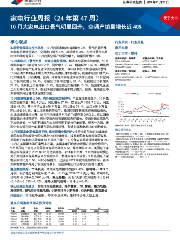 【国信证券】【20241125】家电行业周报(24年第47周):10月大家电出口景气明显回升,空调产销量增长近40%-13页