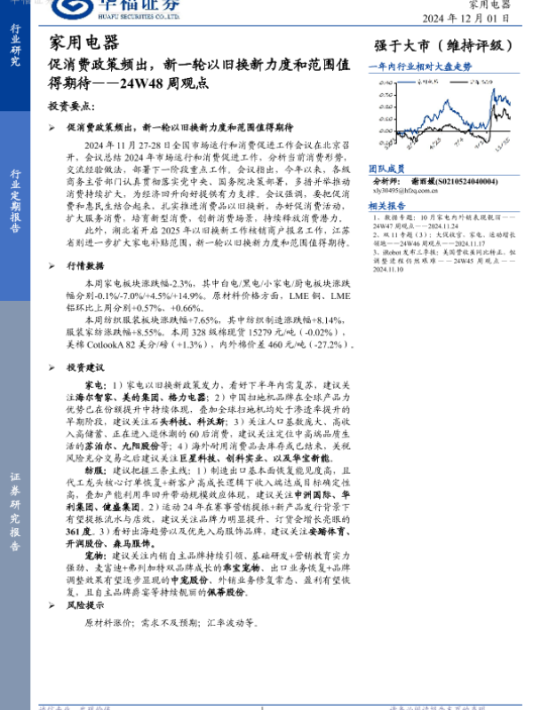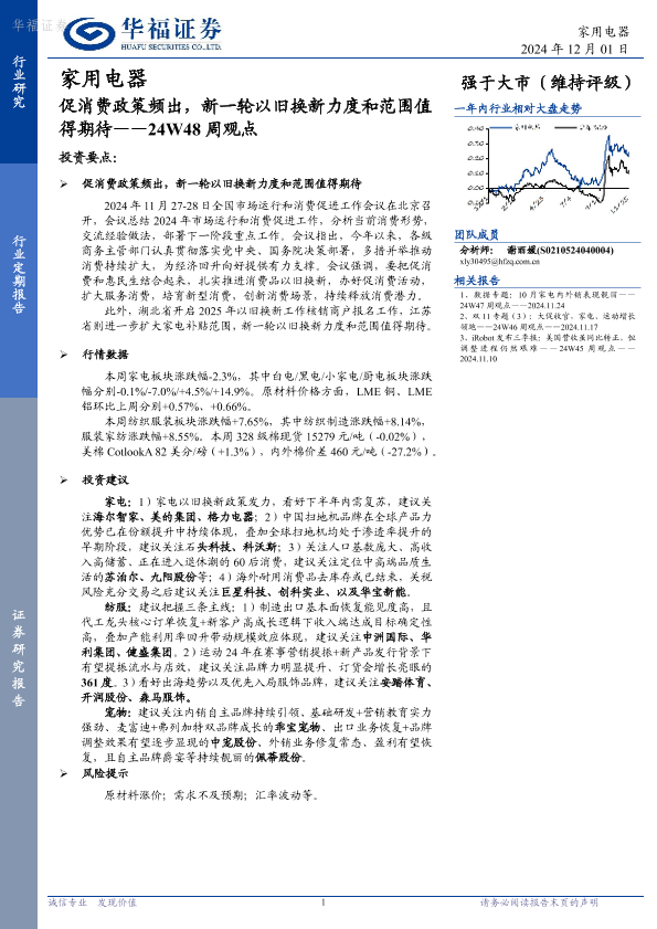 【华福证券】【20241201】家用电器24W48周观点:促消费政策频出,新一轮以旧换新力度和范围值得期待-14页