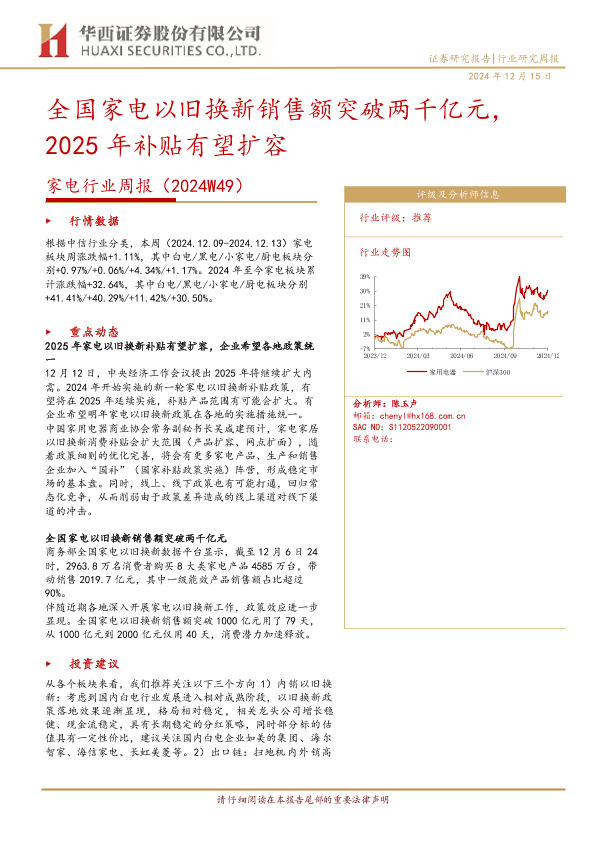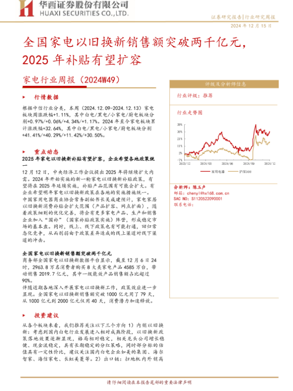 【华西证券】【20241215】家电行业周报(2024W49):全国家电以旧换新销售额突破两千亿元,2025年补贴有望扩容-12页