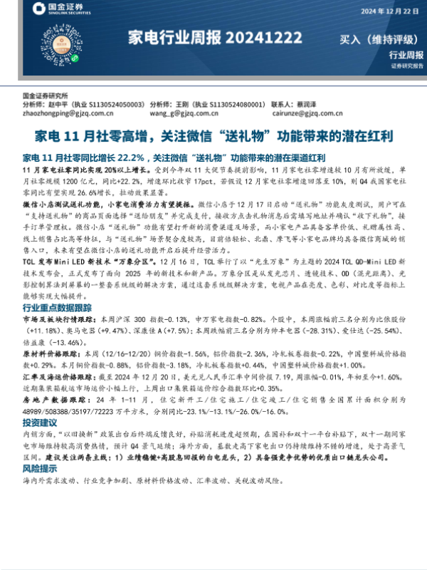 【国金证券】【20241222】家电行业周报:家电11月社零高增,关注微信“送礼物”功能带来的潜在红利-15页