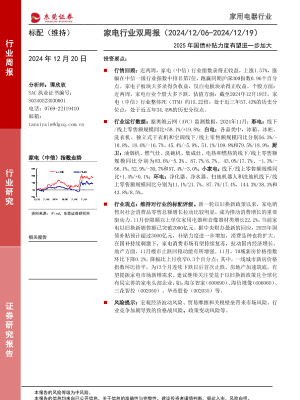 【东莞证券】【20241220】20241220-东莞证券-家电行业双周报:2025年国债补贴力度有望进一步加大-15页