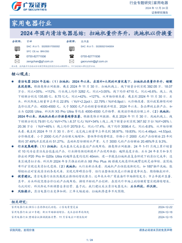 【广发证券】【20241224】2024年国内清洁电器总结:扫地机量价齐升,洗地机以价换量-24页