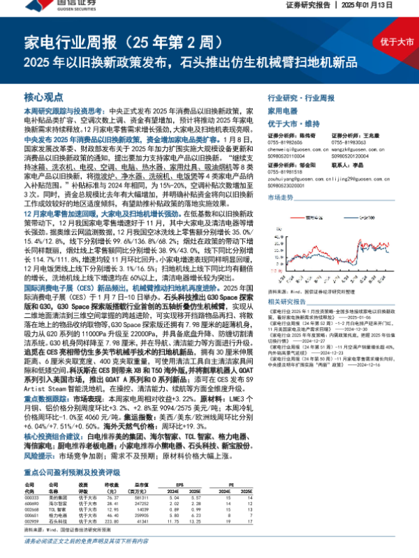 【国信证券】【20250113】家电行业周报(25年第2周):2025年以旧换新政策发布,石头推出仿生机械臂扫地机新品-14页