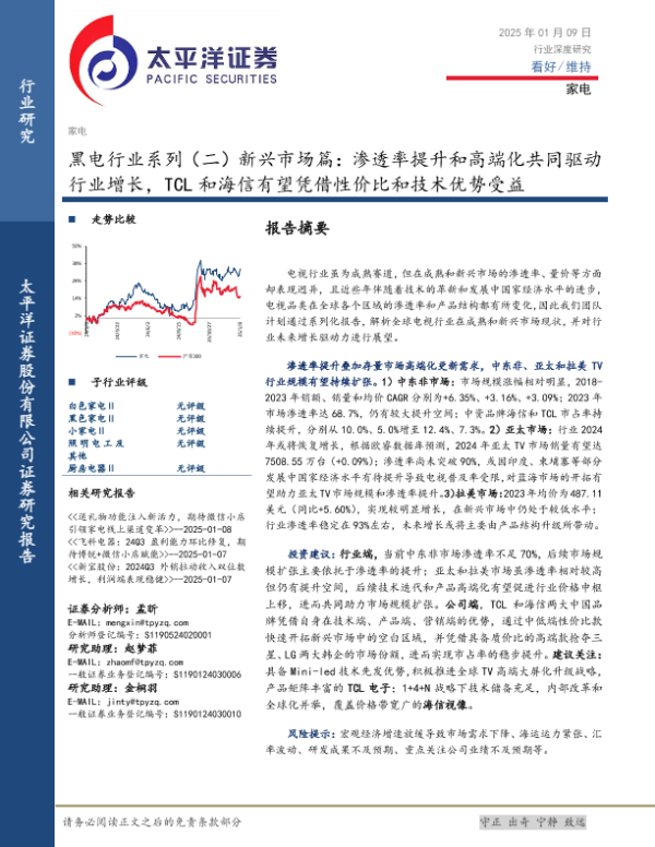 【太平洋证券】【20250109】黑电行业系列(二)新兴市场篇:渗透率提升和高端化共同驱动行业增长,TCL和海信有望凭借性价比和技术优势受益-28页