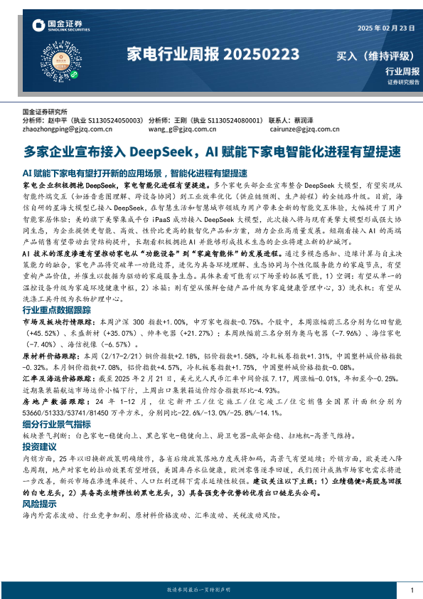 【国金证券】【20250223】家电行业周报:多家企业宣布接入DeepSeek,AI赋能下家电智能化进程有望提速-12页