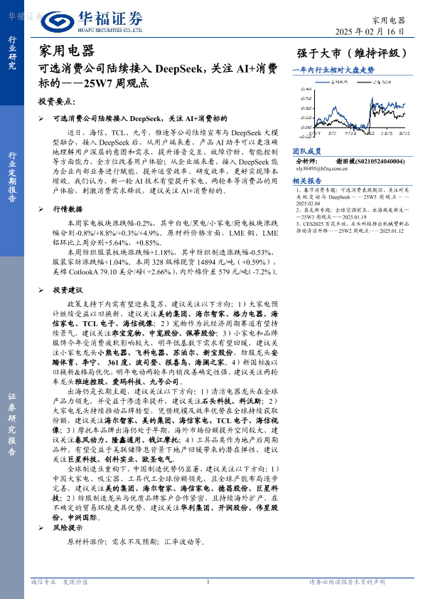 【华福证券】【20250216】家用电器25W7周观点:可选消费公司陆续接入DeepSeek,关注AI+消费标的-16页