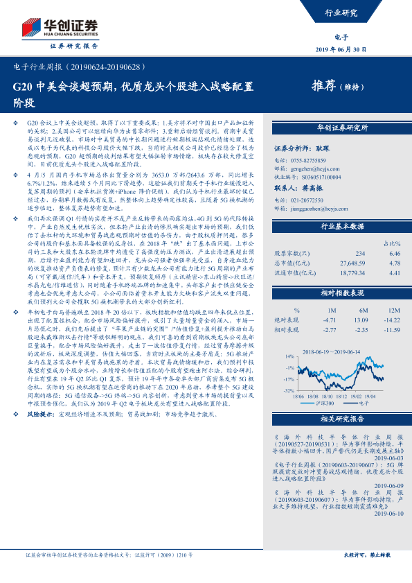 【华创证券】【20190630】20190630-华创证券-电子行业周报:G20中美会谈超预期,优质龙头个股进入战略配置阶段-15页
