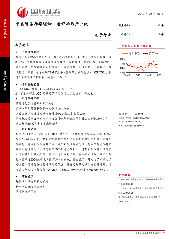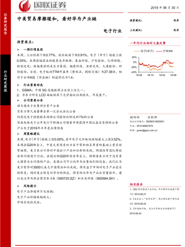 【国联证券】【20190630】电子行业:中美贸易摩擦缓和,看好华为产业链-9页