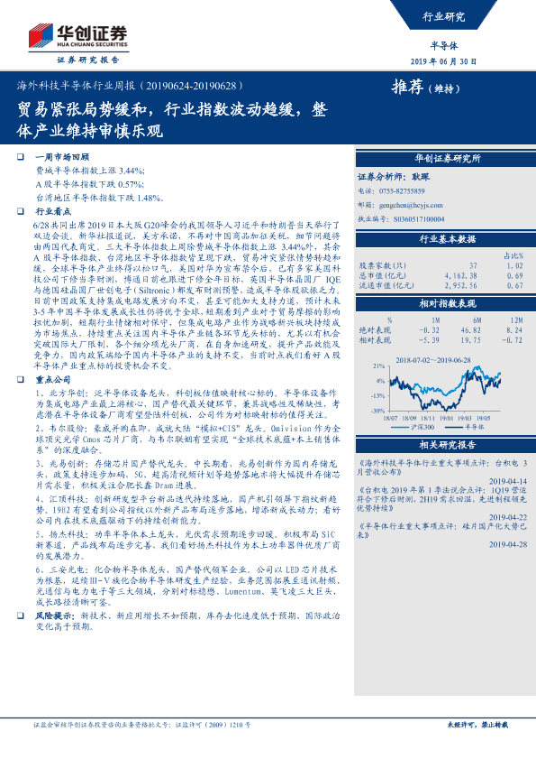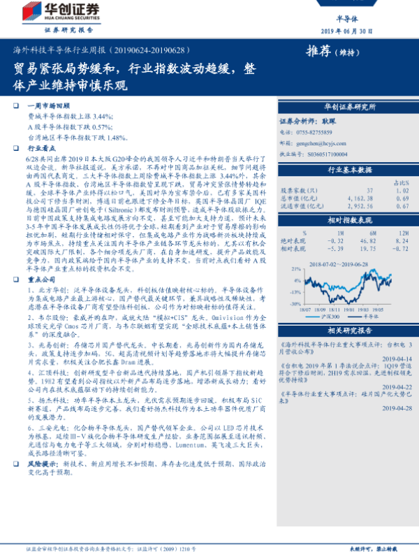 【华创证券】【20190630】20190630-华创证券-海外科技半导体行业周报:贸易紧张局势缓和,行业指数波动趋缓,整体产业维持审慎乐观-11页