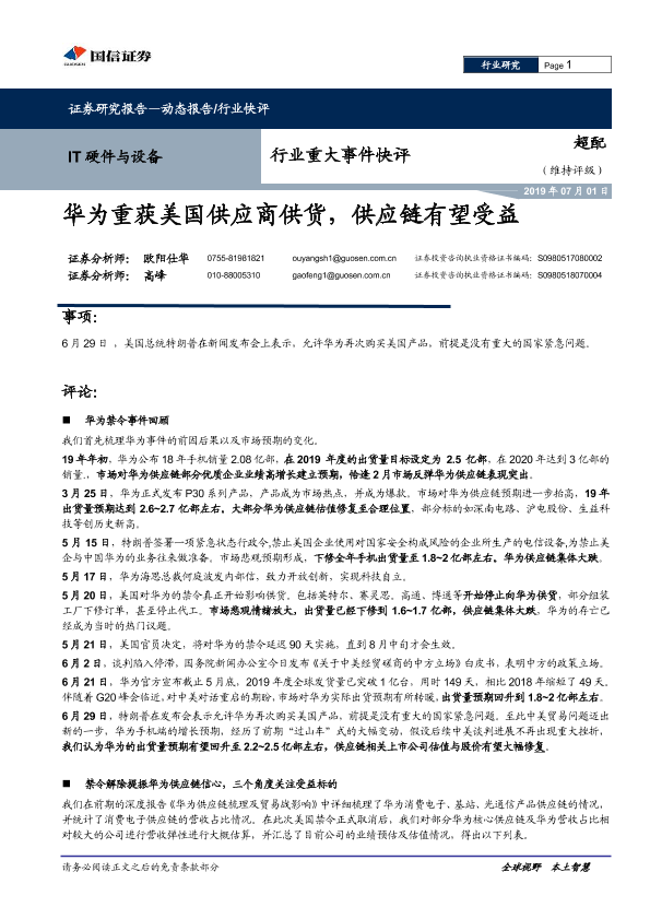 【国信证券】【20190701】IT硬件与设备行业重大事件快评:华为重获美国供应商供货,供应链有望受益-5页