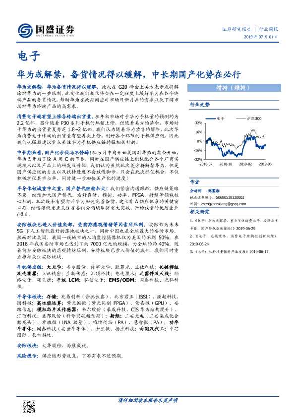 【国盛证券】【20190701】电子行业周报:华为或解禁,备货情况得以缓解,中长期国产化势在必行-14页