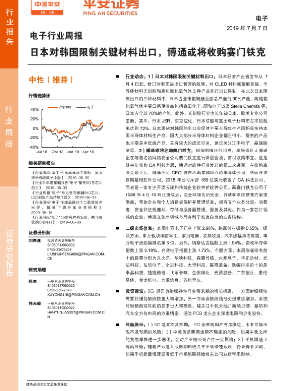 【平安证券】【20190707】电子行业周报:日本对韩国限制关键材料出口,博通或将收购赛门铁克-5页