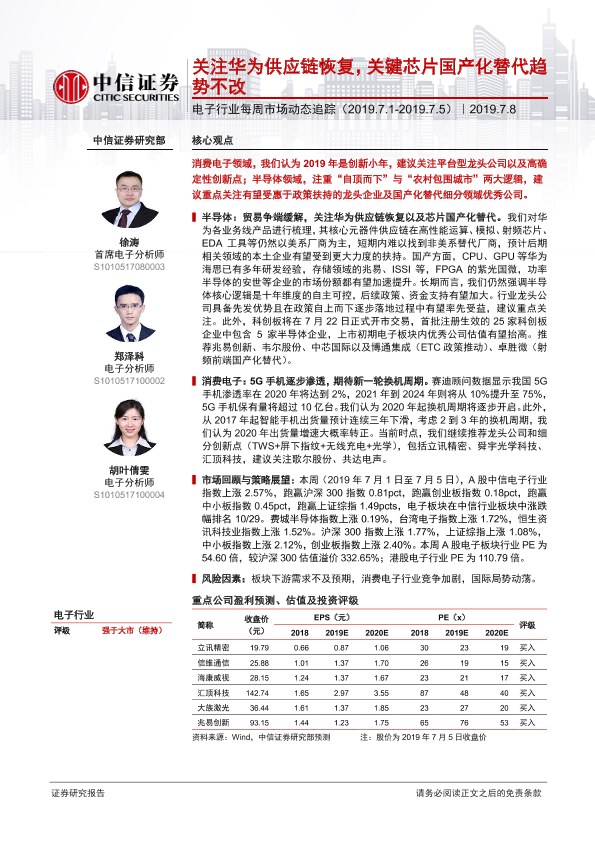 【中信证券】【20190708】20190708-中信证券-电子行业每周市场动态追踪:关注华为供应链恢复,关键芯片国产化替代趋势不改-15页