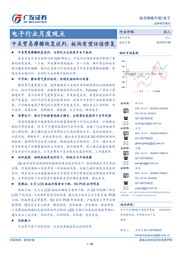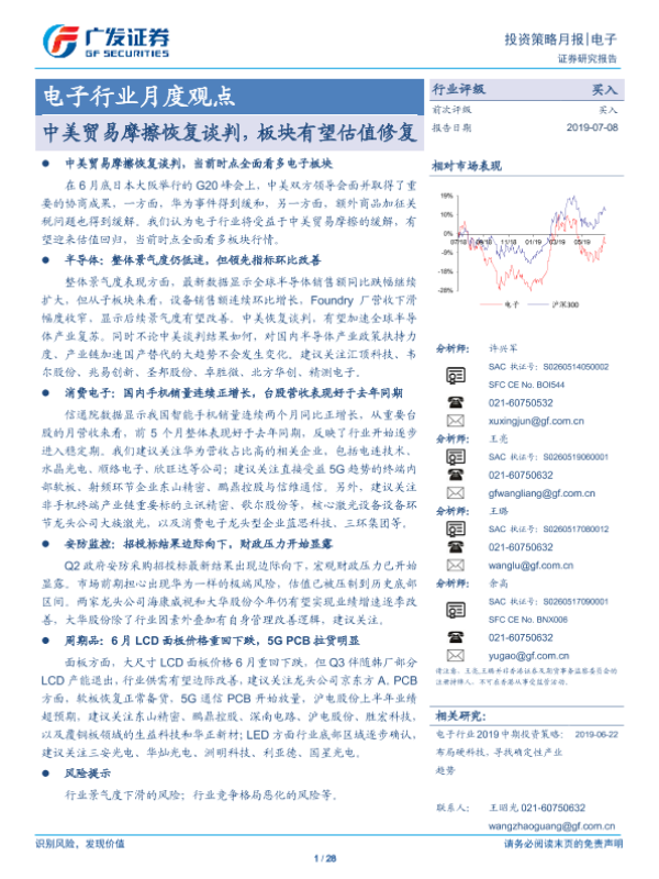 【广发证券】【20190708】20190709-广发证券-电子行业月度观点:中美贸易摩擦恢复谈判,板块有望估值修复-28页