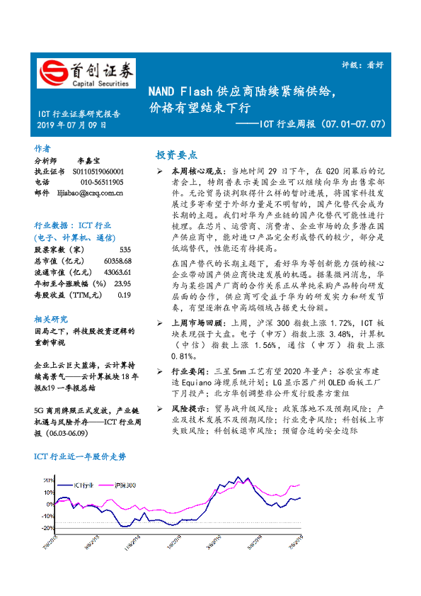 【首创证券】【20190709】ICT行业周报:NAND Flash供应商陆续紧缩供给,价格有望结束下行-14页