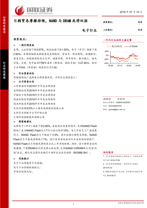 【国联证券】【20190714】20190714-国联证券-电子行业研究简报:日韩贸易摩擦持续,NAND与DRAM或将双涨-9页