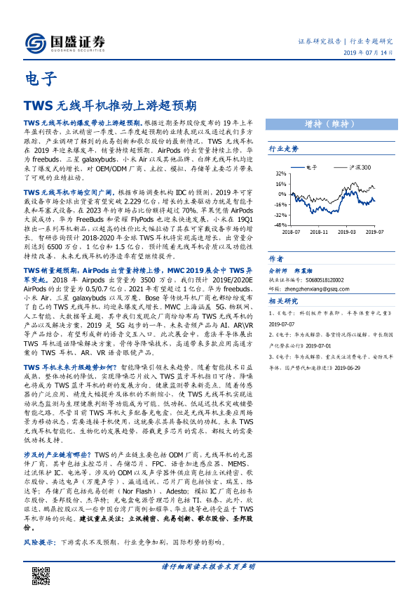 【国盛证券】【20190714】电子行业专题研究:TWS无线耳机推动上游超预期-22页